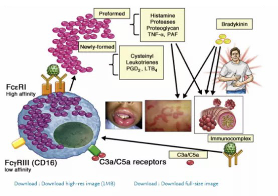 速發(fā)型過敏反應(yīng)的定義是一種嚴(yán)重的、危及生命的、迅速發(fā)展的、廣泛或全身性的超敏反應(yīng)。典型的臨床癥狀包括支氣管收縮、血管擴張、低血容量,可導(dǎo)致呼吸功能不全、休克和死亡。當(dāng)反應(yīng)是由免疫機制(IgE、IgG和補體相關(guān)的免疫復(fù)合物)介導(dǎo)時,被稱為過敏反應(yīng)。根據(jù)IgE的參與情況,反應(yīng)又可分為IgE介導(dǎo)反應(yīng)和非IgE介導(dǎo)反應(yīng)。典型的臨床癥狀包括支氣管收縮、血管擴張和低血容量(單獨或聯(lián)合使用),可導(dǎo)致呼吸功能不全、休克和死亡。兒童過敏反應(yīng)的最主要原因是食物,而成人過敏反應(yīng)的主要原因是藥物,特別是抗生素、神經(jīng)肌肉阻斷劑(NMBA)、非甾體類抗炎藥(NSAID)、造影劑和生物制劑。由IgE抗體介導(dǎo)的過敏反應(yīng)的典型例子是花生誘導(dǎo)的食物過敏反應(yīng),它可被稱為IgE介導(dǎo)的過敏反應(yīng)。這種過敏反應(yīng)通常被認(rèn)為是由于T細(xì)胞識別抗原并啟動Th2型反應(yīng)后,B細(xì)胞產(chǎn)生IgE抗體。