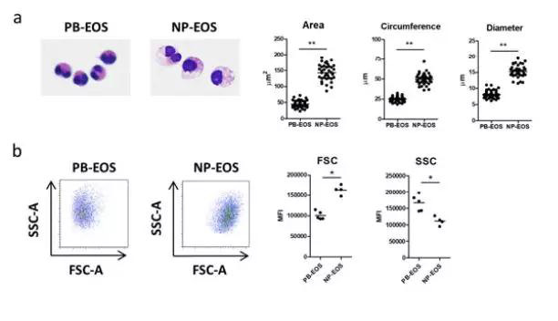 方法:我們建立了一種從嗜酸性鼻竇炎(NP-EOS)患者鼻息肉中分離CD69hi CCR3low CXCR4- siglec-8int 嗜酸粒細(xì)胞的方法,并與健康受試者外周血來源的嗜酸粒細(xì)胞(PB-EOS)進(jìn)行脂質(zhì)組學(xué)、蛋白質(zhì)組學(xué)和轉(zhuǎn)錄組學(xué)的多組學(xué)分析,以分析NP-EOS。