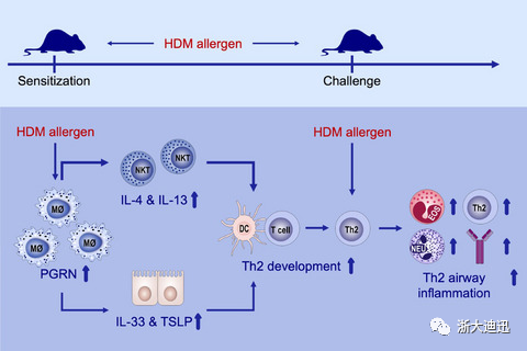 結(jié)論:在致敏早期,氣道中巨噬細(xì)胞源性PGRN的存在可能對(duì)于啟動(dòng)Th2免疫反應(yīng)以及通過(guò)誘導(dǎo)NKT和氣道上皮細(xì)胞中2型細(xì)胞因子的產(chǎn)生引起過(guò)敏性氣道炎癥途徑至關(guān)重要。