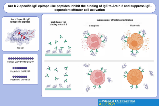 Conclusions: These studies show that the indicated peptides reduce the allergenic activity of Ara h 2 and suppress lgE-dependent basophil and mast cell activation. These observations may suggest a novel therapeutic strategy for food allergy based on epitope–paratop blocking.