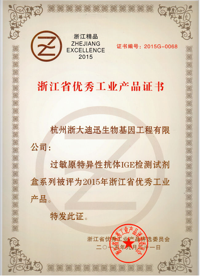公司于2015年10月12日參加了在杭州之江飯店舉辦的“2015浙江省企業(yè)領(lǐng)袖峰會(huì)”,浙江省常務(wù)副省長(zhǎng)袁家軍出席會(huì)議并作重要講話,省人大、省政協(xié)及相關(guān)部門領(lǐng)導(dǎo)蒞臨會(huì)議,會(huì)上發(fā)布并表彰了2015年浙江省優(yōu)秀工業(yè)產(chǎn)品榜單,我公司的“過敏原特異性抗體IgE檢測(cè)試劑盒系列”和“食物特異性抗體IgG/IgG4檢測(cè)試劑盒系列”均榮獲該項(xiàng)榮譽(yù),表示祝賀!